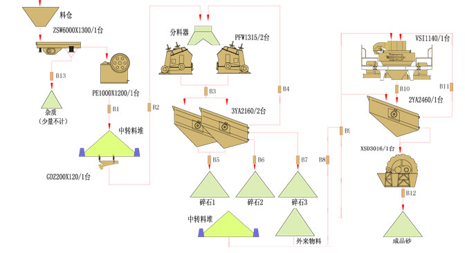当地场地规划的工厂之一,多次受当地政府组团参观。进入砂石行业。 购买本司ZSW600*130给料机、GZD200*120给料机、PE1000*1200颚破、PFW1315反击破2台、3YA2160振动筛2台 、VSI1140离心冲击破、2YA2460振动筛、 XSD3016轮式洗砂机等。